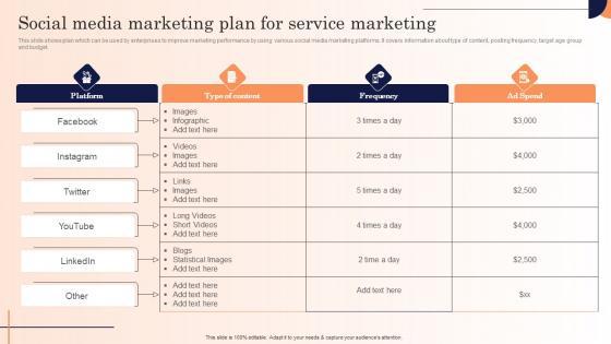This slide shows plan which can be used by enterprises to improve marketing performance by using various social media marketing platforms. It covers information about type of content, posting frequency, target age group and budget. Create an editable Service Promotion Plan Social Media Marketing Plan For Service Marketing Template PDF that communicates your idea and engages your audience. Whether youre presenting a business or an educational presentation, pre-designed presentation templates help save time. Service Promotion Plan Social Media Marketing Plan For Service Marketing Template PDF is highly customizable and very easy to edit, covering many different styles from creative to business presentations. Slidegeeks has creative team members who have crafted amazing templates. So, go and get them without any delay.