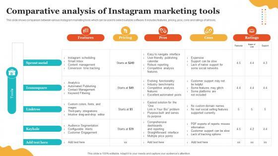 This slide shows comparison between various Instagram marketing tools which can be used to select suitable software. It includes features, pricing, pros, cons and ratings of all tools. Present like a pro with Social Media Marketing To Enhance Comparative Analysis Of Instagram Marketing Tools MKT SS V. Create beautiful presentations together with your team, using our easy-to-use presentation slides. Share your ideas in real-time and make changes on the fly by downloading our templates. So whether you are in the office, on the go, or in a remote location, you can stay in sync with your team and present your ideas with confidence. With Slidegeeks presentation got a whole lot easier. Grab these presentations today. This slide shows comparison between various Instagram marketing tools which can be used to select suitable software. It includes features, pricing, pros, cons and ratings of all tools.