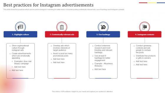 This slide shows four practices which can be used in Instagram marketing for better reach. It includes posting contextually relevant ads, use of hashtags and Instagram contests. Get a simple yet stunning designed Social Media Marketing To Enhance Best Practices For Instagram Advertisements MKT SS V. It is the best one to establish the tone in your meetings. It is an excellent way to make your presentations highly effective. So, download this PPT today from Slidegeeks and see the positive impacts. Our easy-to-edit Social Media Marketing To Enhance Best Practices For Instagram Advertisements MKT SS V can be your go-to option for all upcoming conferences and meetings. So, what are you waiting for Grab this template today. This slide shows four practices which can be used in Instagram marketing for better reach. It includes posting contextually relevant ads, use of hashtags and Instagram contests.