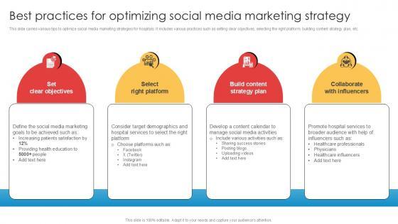 This slide carries various tips to optimize social media marketing strategies for hospitals. It includes various practices such as setting clear objectives, selecting the right platform, building content strategy plan, etc. There are so many reasons you need a Best Practices For Optimizing Social Media Implementation Of Online Ppt Template. The first reason is you can not spend time making everything from scratch, Thus, Slidegeeks has made presentation templates for you too. You can easily download these templates from our website easily. This slide carries various tips to optimize social media marketing strategies for hospitals. It includes various practices such as setting clear objectives, selecting the right platform, building content strategy plan, etc.