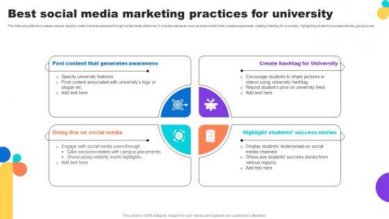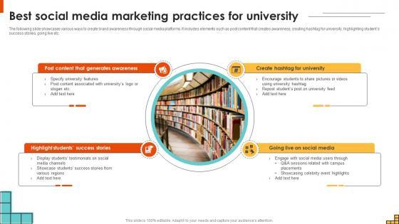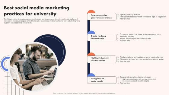 The following slide showcases various ways to create brand awareness through social media platforms. It includes elements such as post content that creates awareness, creating hashtag for university, highlighting students success stories, going live, etc. Whether you have daily or monthly meetings, a brilliant presentation is necessary. Best Social Media Marketing Practices Higher Education Ppt Example Strategy SS V can be your best option for delivering a presentation. Represent everything in detail using Best Social Media Marketing Practices Higher Education Ppt Example Strategy SS V and make yourself stand out in meetings. The template is versatile and follows a structure that will cater to your requirements. All the templates prepared by Slidegeeks are easy to download and edit. Our research experts have taken care of the corporate themes as well. So, give it a try and see the results. The following slide showcases various ways to create brand awareness through social media platforms. It includes elements such as post content that creates awareness, creating hashtag for university, highlighting students success stories, going live, etc.