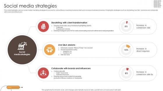 This slide highlights various social media marketing strategies to be used by online fitness coaching business start-up to increase business presence. It highlights strategies such as storytelling, live QandA sessions and collaborate with brand and influencers.Slidegeeks has constructed Social Media Strategies Digital Physical Training Business Market Entry Plan GTM SS V after conducting extensive research and examination. These presentation templates are constantly being generated and modified based on user preferences and critiques from editors. Here, you will find the most attractive templates for a range of purposes while taking into account ratings and remarks from users regarding the content. This is an excellent jumping-off point to explore our content and will give new users an insight into our top-notch PowerPoint Templates. This slide highlights various social media marketing strategies to be used by online fitness coaching business start-up to increase business presence. It highlights strategies such as storytelling, live QandA sessions and collaborate with brand and influencers.