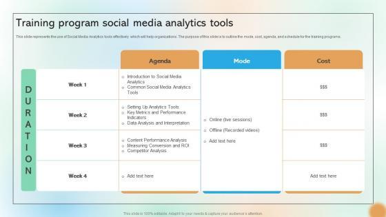 This slide represents the use of Social Media Analytics tools effectively which will help organizations. The purpose of this slide is to outline the mode, cost, agenda, and schedule for the training programs. Find a pre-designed and impeccable Training Program Social Media Analytics Tools Cracking The Code Of Social Media. The templates can ace your presentation without additional effort. You can download these easy-to-edit presentation templates to make your presentation stand out from others. So, what are you waiting for Download the template from Slidegeeks today and give a unique touch to your presentation. This slide represents the use of Social Media Analytics tools effectively which will help organizations. The purpose of this slide is to outline the mode, cost, agenda, and schedule for the training programs.