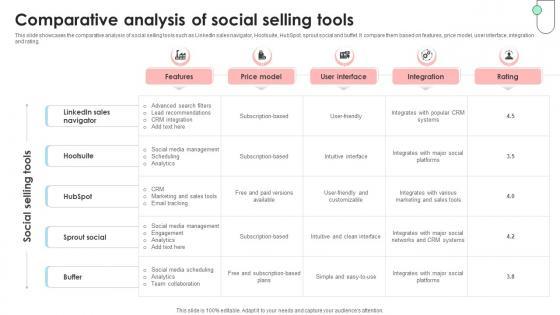 This slide showcases the comparative analysis of social selling tools such as LinkedIn sales navigator, Hootsuite, HubSpot, sprout social and buffet. It compare them based on features, price model, user interface, integration and rating. Welcome to our selection of the Navigating B2B Sales Comparative Analysis Of Social Selling Tools SA SS V. These are designed to help you showcase your creativity and bring your sphere to life. Planning and Innovation are essential for any business that is just starting out. This collection contains the designs that you need for your everyday presentations. All of our PowerPoints are 100Percent editable, so you can customize them to suit your needs. This multi-purpose template can be used in various situations. Grab these presentation templates today. This slide showcases the comparative analysis of social selling tools such as LinkedIn sales navigator, Hootsuite, HubSpot, sprout social and buffet. It compare them based on features, price model, user interface, integration and rating.