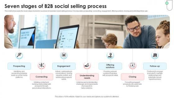This slide showcases the seven steps involved in business to business social selling process. It incorporates prospecting, connecting, engagement, offering solution, closing and collecting follow-ups. Get a simple yet stunning designed Navigating B2B Sales Seven Stages Of B2B Social Selling Process SA SS V. It is the best one to establish the tone in your meetings. It is an excellent way to make your presentations highly effective. So, download this PPT today from Slidegeeks and see the positive impacts. Our easy-to-edit Navigating B2B Sales Seven Stages Of B2B Social Selling Process SA SS V can be your go-to option for all upcoming conferences and meetings. So, what are you waiting for Grab this template today. This slide showcases the seven steps involved in business to business social selling process. It incorporates prospecting, connecting, engagement, offering solution, closing and collecting follow-ups.