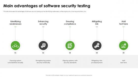 This slide showcases the advantages of software security testing such as identifying weaknesses, enhancing security, ensuring compliance, etc. Make sure to capture your audiences attention in your business displays with our gratis customizable Main Advantages Of Software Harnessing The World Of Ethical Ppt Slide These are great for business strategies, office conferences, capital raising or task suggestions. If you desire to acquire more customers for your tech business and ensure they stay satisfied, create your own sales presentation with these plain slides. This slide showcases the advantages of software security testing such as identifying weaknesses, enhancing security, ensuring compliance, etc.