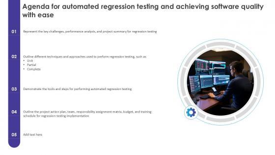 Find a pre-designed and impeccable Agenda For Automated Regression Testing And Achieving Software Quality With Ease PPT Template The templates can ace your presentation without additional effort. You can download these easy-to-edit presentation templates to make your presentation stand out from others. So, what are you waiting for Download the template from Slidegeeks today and give a unique touch to your presentation. Our Agenda For Automated Regression Testing And Achieving Software Quality With Ease PPT Template are topically designed to provide an attractive backdrop to any subject. Use them to look like a presentation pro.