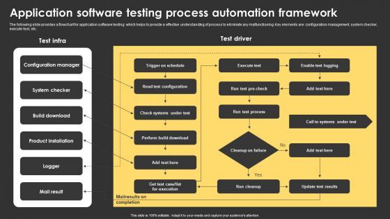 The following slide provides a flowchart for application software testing which helps to provide a effective understanding of process to eliminate any malfunctioning. Key elements are configuration management, system checker, execute test, etc. Pitch your topic with ease and precision using this Application Software Testing Process Automation Framework Introduction Pdf. This layout presents information on Configuration Manager, System Checker, Build Download. It is also available for immediate download and adjustment. So, changes can be made in the color, design, graphics or any other component to create a unique layout. The following slide provides a flowchart for application software testing which helps to provide a effective understanding of process to eliminate any malfunctioning. Key elements are configuration management, system checker, execute test, etc.