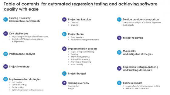 Retrieve professionally designed Table Of Contents Automated Regression Testing And Achieving Software Quality With Ease PPT Example to effectively convey your message and captivate your listeners. Save time by selecting pre-made slideshows that are appropriate for various topics, from business to educational purposes. These themes come in many different styles, from creative to corporate, and all of them are easily adjustable and can be edited quickly. Access them as PowerPoint templates or as Google Slides themes. You do not have to go on a hunt for the perfect presentation because Slidegeeks got you covered from everywhere. Our Table Of Contents Automated Regression Testing And Achieving Software Quality With Ease PPT Example are topically designed to provide an attractive backdrop to any subject. Use them to look like a presentation pro.