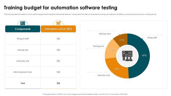 This slide showcases the breakdown cost for performing automation testing for software development. The purpose of this slide is to showcase the training cost breakdown for different components such as instructor, training cost, etc. Retrieve professionally designed Training Budget For Automation Software Testing Smoke Testing Ppt Presentation to effectively convey your message and captivate your listeners. Save time by selecting pre-made slideshows that are appropriate for various topics, from business to educational purposes. These themes come in many different styles, from creative to corporate, and all of them are easily adjustable and can be edited quickly. Access them as PowerPoint templates or as Google Slides themes. You do not have to go on a hunt for the perfect presentation because Slidegeeks got you covered from everywhere. This slide showcases the breakdown cost for performing automation testing for software development. The purpose of this slide is to showcase the training cost breakdown for different components such as instructor, training cost, etc.