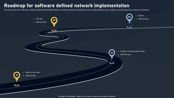 This slide outlines the roadmap for software-defined network implementation, including the steps to be performed, such as defining the use case, creating a cross-functional team, testing, and reviewing. Do you have to make sure that everyone on your team knows about any specific topic I yes, then you should give Roadmap For Software Defined Network Implementation Ppt File Vector PDF a try. Our experts have put a lot of knowledge and effort into creating this impeccable Roadmap For Software Defined Network Implementation Ppt File Vector PDF. You can use this template for your upcoming presentations, as the slides are perfect to represent even the tiniest detail. You can download these templates from the Slidegeeks website and these are easy to edit. So grab these today.