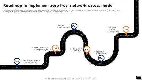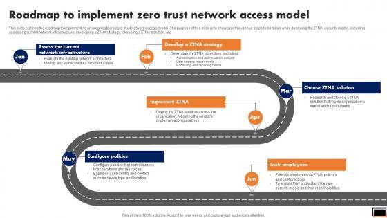 This slide outlines the roadmap to implementing an organizations zero-trust network access model. The purpose of this slide is to showcase the various steps to be taken while deploying the ZTNA security model, including assessing current network infrastructure, developing a ZTNA strategy, choosing a ZTNA solution, etc. This Roadmap To Implement Zero Trust Network Access Model Software Defined Perimeter SDP from Slidegeeks makes it easy to present information on your topic with precision. It provides customization options, so you can make changes to the colors, design, graphics, or any other component to create a unique layout. It is also available for immediate download, so you can begin using it right away. Slidegeeks has done good research to ensure that you have everything you need to make your presentation stand out. Make a name out there for a brilliant performance. This slide outlines the roadmap to implementing an organizations zero-trust network access model. The purpose of this slide is to showcase the various steps to be taken while deploying the ZTNA security model, including assessing current network infrastructure, developing a ZTNA strategy, choosing a ZTNA solution, etc.