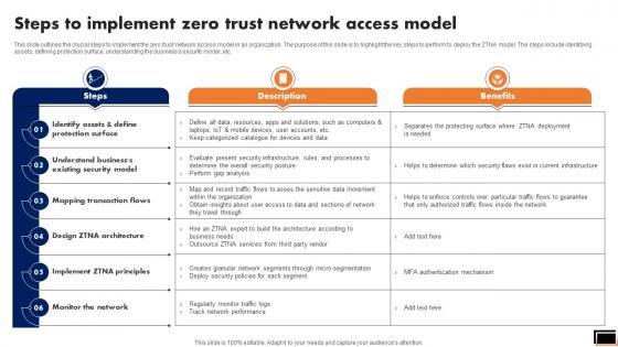 This slide outlines the crucial steps to implement the zero trust network access model in an organization. The purpose of this slide is to highlight the key steps to perform to deploy the ZTNA model. The steps include identifying assets, defining protection surface, understanding the business security model, etc. From laying roadmaps to briefing everything in detail, our templates are perfect for you. You can set the stage with your presentation slides. All you have to do is download these easy-to-edit and customizable templates. Steps To Implement Zero Trust Network Access Model Software Defined Perimeter SDP will help you deliver an outstanding performance that everyone would remember and praise you for. Do download this presentation today. This slide outlines the crucial steps to implement the zero trust network access model in an organization. The purpose of this slide is to highlight the key steps to perform to deploy the ZTNA model. The steps include identifying assets, defining protection surface, understanding the business security model, etc.