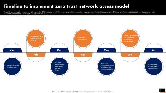 This slide showcases the timeline for implementing the ZTNA security model. This slide highlights the various steps organizations will take while deploying the ZTNA system, forming a dedicated team, choosing zero-trust implementation on-ramp, assessing the environment and so on. Whether you have daily or monthly meetings, a brilliant presentation is necessary. Timeline To Implement Zero Trust Network Access Model Software Defined Perimeter SDP can be your best option for delivering a presentation. Represent everything in detail using Timeline To Implement Zero Trust Network Access Model Software Defined Perimeter SDP and make yourself stand out in meetings. The template is versatile and follows a structure that will cater to your requirements. All the templates prepared by Slidegeeks are easy to download and edit. Our research experts have taken care of the corporate themes as well. So, give it a try and see the results. This slide showcases the timeline for implementing the ZTNA security model. This slide highlights the various steps organizations will take while deploying the ZTNA system, forming a dedicated team, choosing zero-trust implementation on-ramp, assessing the environment and so on.