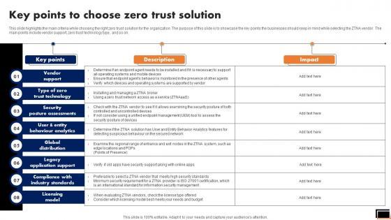 This slide highlights the main criteria while choosing the right zero trust solution for the organization. The purpose of this slide is to showcase the key points the businesses should keep in mind while selecting the ZTNA vendor. The main points include vendor support, zero trust technology type, and so on. This modern and well-arranged Key Points To Choose Zero Trust Solution Software Defined Perimeter SDP provides lots of creative possibilities. It is very simple to customize and edit with the Powerpoint Software. Just drag and drop your pictures into the shapes. All facets of this template can be edited with Powerpoint, no extra software is necessary. Add your own material, put your images in the places assigned for them, adjust the colors, and then you can show your slides to the world, with an animated slide included. This slide highlights the main criteria while choosing the right zero trust solution for the organization. The purpose of this slide is to showcase the key points the businesses should keep in mind while selecting the ZTNA vendor. The main points include vendor support, zero trust technology type, and so on.