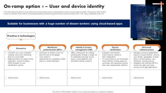 This slide outlines the first on-ramp option of zero trust network access implementation, which is user and device identity. The purpose of this slide is to give an overview of the method, including the practices and technologies involved, such as biometrics, MFA, IAM, device certification and so on. The best PPT templates are a great way to save time, energy, and resources. Slidegeeks have 100 percent editable powerpoint slides making them incredibly versatile. With these quality presentation templates, you can create a captivating and memorable presentation by combining visually appealing slides and effectively communicating your message. Download On Ramp Option 1 User And Device Identity Software Defined Perimeter SDP from Slidegeeks and deliver a wonderful presentation. This slide outlines the first on-ramp option of zero trust network access implementation, which is user and device identity. The purpose of this slide is to give an overview of the method, including the practices and technologies involved, such as biometrics, MFA, IAM, device certification and so on.
