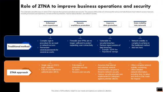 This slide talks about the ways in which ZTNA improves the business operations and security. The purpose of this slide is to showcase the various domains that zero trust network access improves, including increased user experience, remote workforce protection, improve data protection, and network visibility. Take your projects to the next level with our ultimate collection of Role Of Ztna To Improve Business Operations And Security Software Defined Perimeter SDP. Slidegeeks has designed a range of layouts that are perfect for representing task or activity duration, keeping track of all your deadlines at a glance. Tailor these designs to your exact needs and give them a truly corporate look with your own brand colors they will make your projects stand out from the rest This slide talks about the ways in which ZTNA improves the business operations and security. The purpose of this slide is to showcase the various domains that zero trust network access improves, including increased user experience, remote workforce protection, improve data protection, and network visibility.