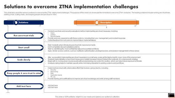 This slide talks about the various solutions to overcome the ZTNA deployment challenges. The purpose of this slide is to showcase the remedies to overcome ZTNA obstacles. The leading solutions include running zero-trust trials, starting small, scaling slowly, and keeping people and zero trust in mind. Create an editable Solutions To Overcome Ztna Implementation Challenges Software Defined Perimeter SDP that communicates your idea and engages your audience. Whether you are presenting a business or an educational presentation, pre-designed presentation templates help save time. Solutions To Overcome Ztna Implementation Challenges Software Defined Perimeter SDP is highly customizable and very easy to edit, covering many different styles from creative to business presentations. Slidegeeks has creative team members who have crafted amazing templates. So, go and get them without any delay. This slide talks about the various solutions to overcome the ZTNA deployment challenges. The purpose of this slide is to showcase the remedies to overcome ZTNA obstacles. The leading solutions include running zero-trust trials, starting small, scaling slowly, and keeping people and zero trust in mind.