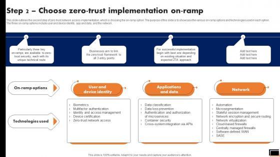 This slide outlines the second step of zero trust network access implementation, which is choosing the on-ramp option. The purpose of this slide is to showcase the various on-ramp options and technologies used in each option. The three on-ramp options include user and device identity, app and data, and the network. Want to ace your presentation in front of a live audience Our Step 2 Choose Zero Trust Implementation On Ramp Software Defined Perimeter SDP can help you do that by engaging all the users towards you. Slidegeeks experts have put their efforts and expertise into creating these impeccable powerpoint presentations so that you can communicate your ideas clearly. Moreover, all the templates are customizable, and easy-to-edit and downloadable. Use these for both personal and commercial use. This slide outlines the second step of zero trust network access implementation, which is choosing the on-ramp option. The purpose of this slide is to showcase the various on-ramp options and technologies used in each option. The three on-ramp options include user and device identity, app and data, and the network.