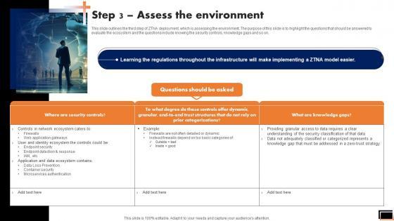 This slide outlines the third step of ZTNA deployment, which is assessing the environment. The purpose of this slide is to highlight the questions that should be answered to evaluate the ecosystem and the questions include knowing the security controls, knowledge gaps and so on. There are so many reasons you need a Step 3 Assess The Environment Software Defined Perimeter SDP. The first reason is you can not spend time making everything from scratch, Thus, Slidegeeks has made presentation templates for you too. You can easily download these templates from our website easily. This slide outlines the third step of ZTNA deployment, which is assessing the environment. The purpose of this slide is to highlight the questions that should be answered to evaluate the ecosystem and the questions include knowing the security controls, knowledge gaps and so on.