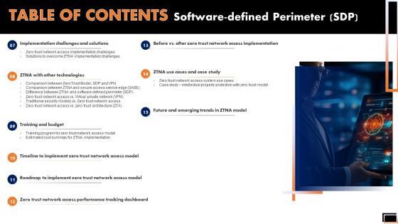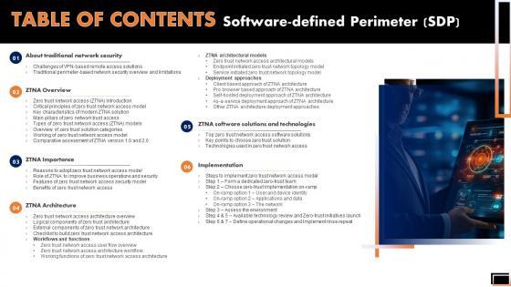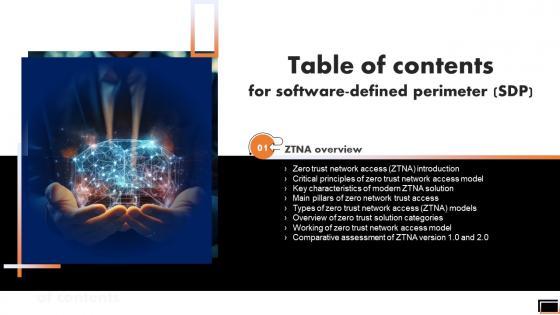 Slidegeeks is here to make your presentations a breeze with Table Of Contents Software Defined Perimeter SDP With our easy-to-use and customizable templates, you can focus on delivering your ideas rather than worrying about formatting. With a variety of designs to choose from, you are sure to find one that suits your needs. And with animations and unique photos, illustrations, and fonts, you can make your presentation pop. So whether you are giving a sales pitch or presenting to the board, make sure to check out Slidegeeks first Our Table Of Contents Software Defined Perimeter SDP are topically designed to provide an attractive backdrop to any subject. Use them to look like a presentation pro.