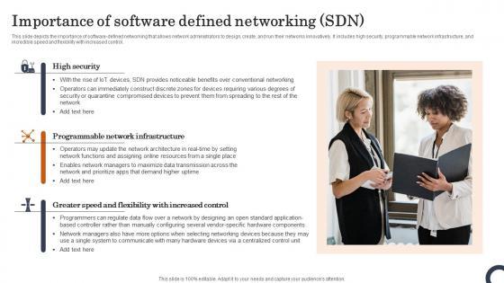 This slide depicts the importance of software-defined networking that allows network administrators to design, create, and run their networks innovatively. It includes high security, programmable network infrastructure, and incredible speed and flexibility with increased control. Explore a selection of the finest Importance Of Software Defined Networking SDN Evolution Of SDN Controllers Demonstration Pdf here. With a plethora of professionally designed and pre-made slide templates, you can quickly and easily find the right one for your upcoming presentation. You can use our Importance Of Software Defined Networking SDN Evolution Of SDN Controllers Demonstration Pdf to effectively convey your message to a wider audience. Slidegeeks has done a lot of research before preparing these presentation templates. The content can be personalized and the slides are highly editable. Grab templates today from Slidegeeks. This slide depicts the importance of software-defined networking that allows network administrators to design, create, and run their networks innovatively. It includes high security, programmable network infrastructure, and incredible speed and flexibility with increased control.