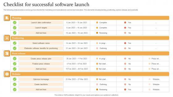 The following slide provides a service go live checklist for marketing communications to oversee task execution. The elements include planning, positioning, a press release, and a website.Pitch your topic with ease and precision using this Checklist For Successful Software Launch Brochure Pdf This layout presents information on Elaborate Software, Benefits Positioning, Optimize Homepage It is also available for immediate download and adjustment. So, changes can be made in the color, design, graphics or any other component to create a unique layout. The following slide provides a service go live checklist for marketing communications to oversee task execution. The elements include planning, positioning, a press release, and a website.