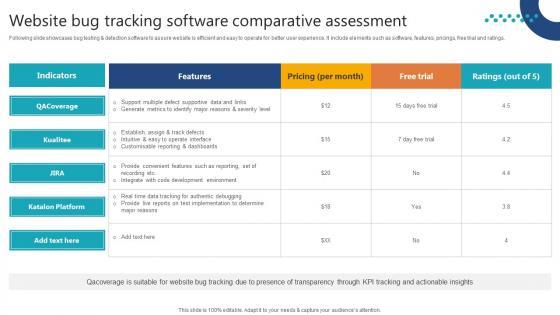 Following slide showcases bug testing and detection software to assure website is efficient and easy to operate for better user experience. It include elements such as software, features, pricings, free trial and ratings. Welcome to our selection of the Complete Guide To Launch Website Bug Tracking Software Comparative Assessment. These are designed to help you showcase your creativity and bring your sphere to life. Planning and Innovation are essential for any business that is just starting out. This collection contains the designs that you need for your everyday presentations. All of our PowerPoints are 100Percent editable, so you can customize them to suit your needs. This multi-purpose template can be used in various situations. Grab these presentation templates today. Following slide showcases bug testing and detection software to assure website is efficient and easy to operate for better user experience. It include elements such as software, features, pricings, free trial and ratings.
