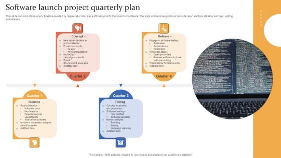 Presenting the quarterly software application roadmap with launch best practices slides. The template includes a roadmap that can be used to initiate a strategic plan. Not only this, the PowerPoint slideshow is completely editable and you can effortlessly modify the font size, font type, and shapes according to your needs. This PPT slide can be easily reached in standard screen and widescreen aspect ratios. The set is also available in various formats like PDF, PNG, and JPG. So download and use it multiple times as per your knowledge.