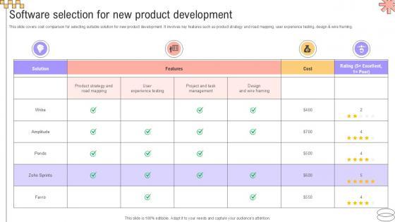 This slide covers cost comparison for selecting suitable solution for new product development. It involves key features such as product strategy and road mapping, user experience testing, design and wire framing. Create an editable Deploying Strategies For Business Software Selection For New Product Development Strategy SS V that communicates your idea and engages your audience. Whether you are presenting a business or an educational presentation, pre-designed presentation templates help save time. Deploying Strategies For Business Software Selection For New Product Development Strategy SS V is highly customizable and very easy to edit, covering many different styles from creative to business presentations. Slidegeeks has creative team members who have crafted amazing templates. So, go and get them without any delay. This slide covers cost comparison for selecting suitable solution for new product development. It involves key features such as product strategy and road mapping, user experience testing, design and wire framing.