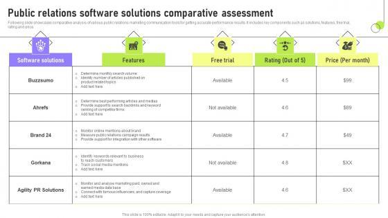 Following slide showcases comparative analysis of various public relations marketing communication tools for getting accurate performance results. It includes key components such as solutions, features, free trial, rating and price. Whether you have daily or monthly meetings, a brilliant presentation is necessary. Public Relations Software Solutions Comparative Assessment Sample PDF can be your best option for delivering a presentation. Represent everything in detail using Public Relations Software Solutions Comparative Assessment Sample PDF and make yourself stand out in meetings. The template is versatile and follows a structure that will cater to your requirements. All the templates prepared by Slidegeeks are easy to download and edit. Our research experts have taken care of the corporate themes as well. So, give it a try and see the results.