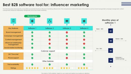 The following slide showcases the comparative assessment of various influencer marketing software tools. The comparison is made on the basis of key features such as brand management, campaign management, content management, influencer relationship management, and social media monitoring. Do you have an important presentation coming up Are you looking for something that will make your presentation stand out from the rest Look no further than Best B2B Software Tool Digital Marketing Strategies To Improve Enterprise Sales Portrait Pdf. With our professional designs, you can trust that your presentation will pop and make delivering it a smooth process. And with Slidegeeks, you can trust that your presentation will be unique and memorable. So why wait Grab Best B2B Software Tool Digital Marketing Strategies To Improve Enterprise Sales Portrait Pdf today and make your presentation stand out from the rest The following slide showcases the comparative assessment of various influencer marketing software tools. The comparison is made on the basis of key features such as brand management, campaign management, content management, influencer relationship management, and social media monitoring.