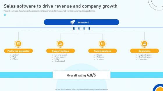 This slide showcases the suitable software selected and its customers, platforms supported, overall rating, training and support options. Slidegeeks is one of the best resources for PowerPoint templates. You can download easily and regulate Digital Marketing Strategies Sales Software To Drive Revenue And Company Growth SA SS V for your personal presentations from our wonderful collection. A few clicks is all it takes to discover and get the most relevant and appropriate templates. Use our Templates to add a unique zing and appeal to your presentation and meetings. All the slides are easy to edit and you can use them even for advertisement purposes. This slide showcases the suitable software selected and its customers, platforms supported, overall rating, training and support options.
