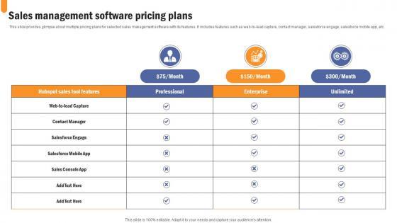 This slide provides glimpse about multiple pricing plans for selected sales management software with its features. It includes features such as web to lead capture, contact manager, salesforce engage, salesforce mobile app, etc. This Sales Management Software Effective Sales Strategy To Enhance Customer Retention Formats Pdf from Slidegeeks makes it easy to present information on your topic with precision. It provides customization options, so you can make changes to the colors, design, graphics, or any other component to create a unique layout. It is also available for immediate download, so you can begin using it right away. Slidegeeks has done good research to ensure that you have everything you need to make your presentation stand out. Make a name out there for a brilliant performance. This slide provides glimpse about multiple pricing plans for selected sales management software with its features. It includes features such as web to lead capture, contact manager, salesforce engage, salesforce mobile app, etc.