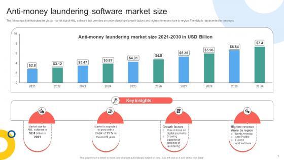 The following slide illustrates the global market size of AML software that provides an understanding of growth factors and highest revenue share by region. The data is represented for ten years. Whether you have daily or monthly meetings, a brilliant presentation is necessary. Anti Money Laundering Software Market Size Mapping Out The Anti Money Fin SS V can be your best option for delivering a presentation. Represent everything in detail using Anti Money Laundering Software Market Size Mapping Out The Anti Money Fin SS V and make yourself stand out in meetings. The template is versatile and follows a structure that will cater to your requirements. All the templates prepared by Slidegeeks are easy to download and edit. Our research experts have taken care of the corporate themes as well. So, give it a try and see the results. The following slide illustrates the global market size of AML software that provides an understanding of growth factors and highest revenue share by region. The data is represented for ten years.