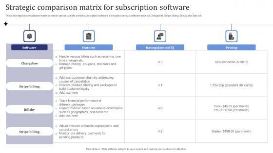 This slide depicts comparison matrix for which can be used to select subscription software. It includes various software such as Chargebee, Stripe billing, Billsby and Stax bill. Showcasing this set of slides titled Strategic Comparison Matrix For Subscription Software Formats Pdf. The topics addressed in these templates are Chargebee, Stripe Billing, Billsby. All the content presented in this PPT design is completely editable. Download it and make adjustments in color, background, font etc. as per your unique business setting. This slide depicts comparison matrix for which can be used to select subscription software. It includes various software such as Chargebee, Stripe billing, Billsby and Stax bill.