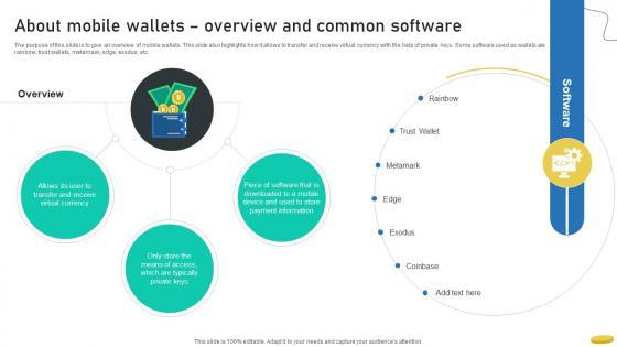 The purpose of this slide is to give an overview of mobile wallets. This slide also highlights how it allows to transfer and receive virtual currency with the help of private keys. Some software used as wallets are rainbow, trust wallets, metamask, edge, exodus, etc.Slidegeeks is one of the best resources for PowerPoint templates. You can download easily and regulate About Mobile Wallets Overview And Common Software Cryptocurrency Management With Blockchain for your personal presentations from our wonderful collection. A few clicks is all it takes to discover and get the most relevant and appropriate templates. Use our Templates to add a unique zing and appeal to your presentation and meetings. All the slides are easy to edit and you can use them even for advertisement purposes. The purpose of this slide is to give an overview of mobile wallets. This slide also highlights how it allows to transfer and receive virtual currency with the help of private keys. Some software used as wallets are rainbow, trust wallets, metamask, edge, exodus, etc.