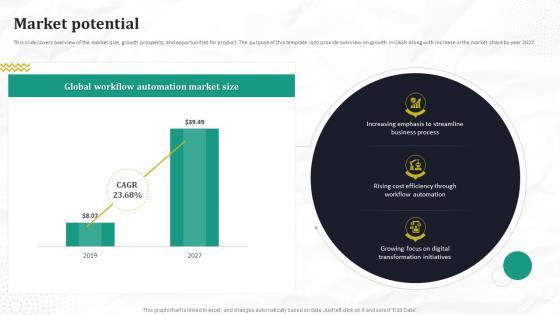 This slide covers overview of the market size, growth prospects, and opportunities for product. The purpose of this template is to provide overview on growth in CAGR along with increase in the market share by year 2027. If you are looking for a format to display your unique thoughts, then the professionally designed Market Potential Automated Workflow Software Funding Pitch Deck For Company is the one for you. You can use it as a Google Slides template or a PowerPoint template. Incorporate impressive visuals, symbols, images, and other charts. Modify or reorganize the text boxes as you desire. Experiment with shade schemes and font pairings. Alter, share or cooperate with other people on your work. Download Market Potential Automated Workflow Software Funding Pitch Deck For Company and find out how to give a successful presentation. Present a perfect display to your team and make your presentation unforgettable. This slide covers overview of the market size, growth prospects, and opportunities for product. The purpose of this template is to provide overview on growth in CAGR along with increase in the market share by year 2027.