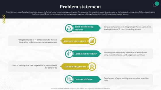 This slide covers issues faced by companies in absence of effective human resource management system. The purpose of this template is to provide an overview on the issues such as integration of different applications leading to manual and time consuming process, increasing company expenses, suffering of productivity and efficiency due to repeated task, etc. Make sure to capture your audiences attention in your business displays with our gratis customizable Problem Statement Automated Workflow Software Funding Pitch Deck For Company. These are great for business strategies, office conferences, capital raising or task suggestions. If you desire to acquire more customers for your tech business and ensure they stay satisfied, create your own sales presentation with these plain slides. This slide covers issues faced by companies in absence of effective human resource management system. The purpose of this template is to provide an overview on the issues such as integration of different applications leading to manual and time consuming process, increasing company expenses, suffering of productivity and efficiency due to repeated task, etc.