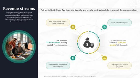 This slide covers various sources of revenue for the company. The purpose of this template is to provide an overview of sources such as paid subscription plans, team and business plans along with partner programs to generate companys revenue. Coming up with a presentation necessitates that the majority of the effort goes into the content and the message you intend to convey. The visuals of a PowerPoint presentation can only be effective if it supplements and supports the story that is being told. Keeping this in mind our experts created Revenue Streams Automated Workflow Software Funding Pitch Deck For Company to reduce the time that goes into designing the presentation. This way, you can concentrate on the message while our designers take care of providing you with the right template for the situation. This slide covers various sources of revenue for the company. The purpose of this template is to provide an overview of sources such as paid subscription plans, team and business plans along with partner programs to generate companys revenue.