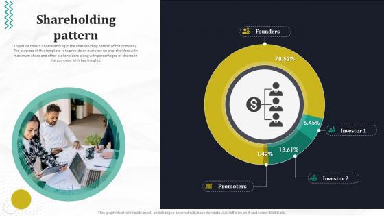 This slide covers understanding of the shareholding pattern of the company. The purpose of this template is to provide an overview on shareholders with maximum share and other stakeholders along with percentages of shares in the company with key insights. This modern and well-arranged Shareholding Pattern Automated Workflow Software Funding Pitch Deck For Company provides lots of creative possibilities. It is very simple to customize and edit with the Powerpoint Software. Just drag and drop your pictures into the shapes. All facets of this template can be edited with Powerpoint, no extra software is necessary. Add your own material, put your images in the places assigned for them, adjust the colors, and then you can show your slides to the world, with an animated slide included. This slide covers understanding of the shareholding pattern of the company. The purpose of this template is to provide an overview on shareholders with maximum share and other stakeholders along with percentages of shares in the company with key insights.
