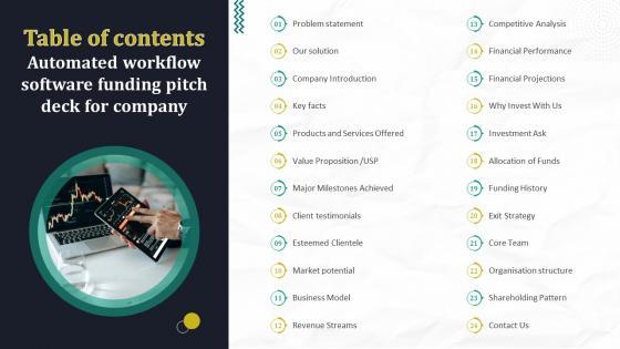 This Table Of Contents Automated Workflow Software Funding Pitch Deck For Company is perfect for any presentation, be it in front of clients or colleagues. It is a versatile and stylish solution for organizing your meetings. The Table Of Contents Automated Workflow Software Funding Pitch Deck For Company features a modern design for your presentation meetings. The adjustable and customizable slides provide unlimited possibilities for acing up your presentation. Slidegeeks has done all the homework before launching the product for you. So, do not wait, grab the presentation templates today Our Table Of Contents Automated Workflow Software Funding Pitch Deck For Company are topically designed to provide an attractive backdrop to any subject. Use them to look like a presentation pro.