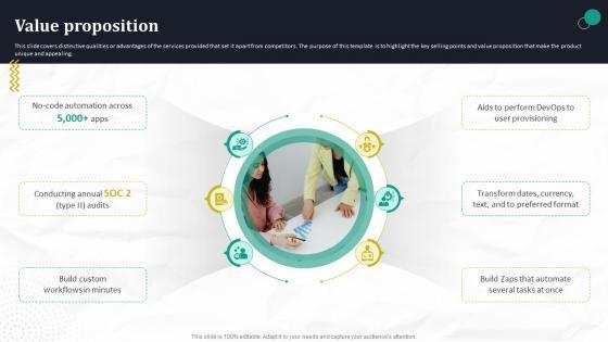 This slide covers distinctive qualities or advantages of the services provided that set it apart from competitors. The purpose of this template is to highlight the key selling points and value proposition that make the product unique and appealing. Explore a selection of the finest Value Proposition Automated Workflow Software Funding Pitch Deck For Company here. With a plethora of professionally designed and pre-made slide templates, you can quickly and easily find the right one for your upcoming presentation. You can use our Value Proposition Automated Workflow Software Funding Pitch Deck For Company to effectively convey your message to a wider audience. Slidegeeks has done a lot of research before preparing these presentation templates. The content can be personalized and the slides are highly editable. Grab templates today from Slidegeeks. This slide covers distinctive qualities or advantages of the services provided that set it apart from competitors. The purpose of this template is to highlight the key selling points and value proposition that make the product unique and appealing.