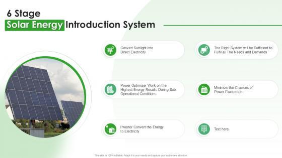 Find a pre-designed and impeccable 6 Stage Solar Energy Introduction System. The templates can ace your presentation without additional effort. You can download these easy-to-edit presentation templates to make your presentation stand out from others. So, what are you waiting for Download the template from Slidegeeks today and give a unique touch to your presentation. Our 6 Stage Solar Energy Introduction System is topically intended to create a visually appealing backdrop to any subject. Use these to make your presentation appear professional.