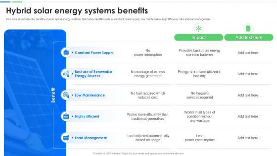 Make sure to capture your audiences attention in your business displays with our gratis customizable Hybrid Solar Energy Systems Benefits. These are great for business strategies, office conferences, capital raising or task suggestions. If you desire to acquire more customers for your tech business and ensure they stay satisfied, create your own sales presentation with these plain slides. This PowerPoint highlights the advantages of solar hybrid energy systems. It offers advantages such as steady power supply, inexpensive maintenance, high efficiency, and load management.