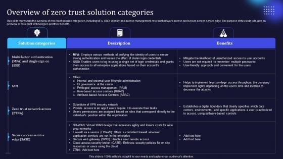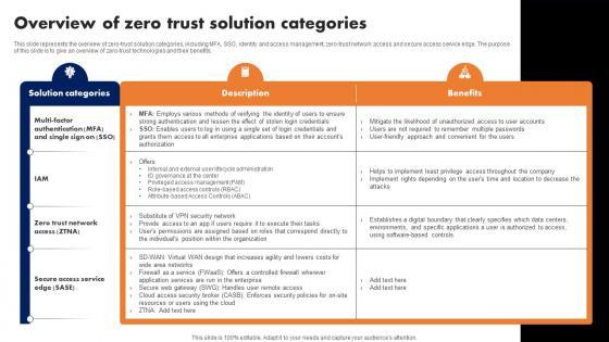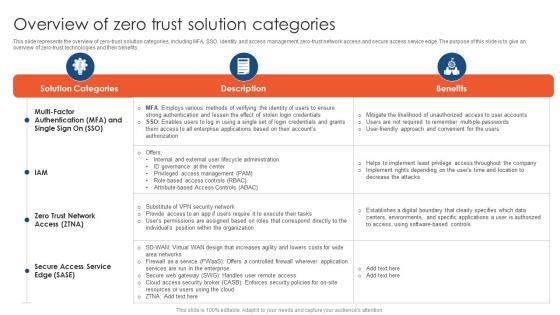 This slide represents the overview of zero-trust solution categories, including MFA, SSO, identity and access management, zero-trust network access and secure access service edge. The purpose of this slide is to give an overview of zero-trust technologies and their benefits. Slidegeeks is one of the best resources for PowerPoint templates. You can download easily and regulate Zero Trust Network Access Overview Of Zero Trust Solution Categories for your personal presentations from our wonderful collection. A few clicks is all it takes to discover and get the most relevant and appropriate templates. Use our Templates to add a unique zing and appeal to your presentation and meetings. All the slides are easy to edit and you can use them even for advertisement purposes. This slide represents the overview of zero-trust solution categories, including MFA, SSO, identity and access management, zero-trust network access and secure access service edge. The purpose of this slide is to give an overview of zero-trust technologies and their benefits.
