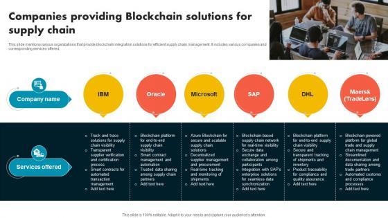 This slide mentions various organizations that provide blockchain integration solutions for efficient supply chain management. It includes various companies and corresponding services offered. The best PPT templates are a great way to save time, energy, and resources. Slidegeeks have 100 percent editable powerpoint slides making them incredibly versatile. With these quality presentation templates, you can create a captivating and memorable presentation by combining visually appealing slides and effectively communicating your message. Download Companies Providing Blockchain Solutions For Chain Supply Chain Evolution Harnessing The Power BCT SS V from Slidegeeks and deliver a wonderful presentation. This slide mentions various organizations that provide blockchain integration solutions for efficient supply chain management. It includes various companies and corresponding services offered.