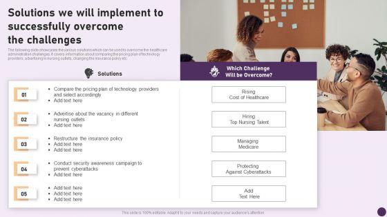 The following slide showcases the various solutions which can be used to overcome the healthcare administration challenges. It covers information about comparing the pricing plan of technology providers, advertising in nursing outlets, changing the insurance policy etc. From laying roadmaps to briefing everything in detail, our templates are perfect for you. You can set the stage with your presentation slides. All you have to do is download these easy to edit and customizable templates. Guide To Healthcare Services Administration Solutions We Will Implement To Successfully Overcome The Challenges Brochure PDF will help you deliver an outstanding performance that everyone would remember and praise you for. Do download this presentation today.