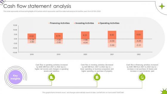 This slide represents on financial highlights of Accenture which represents cash flow statement analysis for last five years from 2018 to 2022.There are so many reasons you need a Cash Flow Statement Analysis Global Innovation And Business Solutions Company Profile CP SS V. The first reason is you can not spend time making everything from scratch, Thus, Slidegeeks has made presentation templates for you too. You can easily download these templates from our website easily. This slide represents on financial highlights of Accenture which represents cash flow statement analysis for last five years from 2018 to 2022.