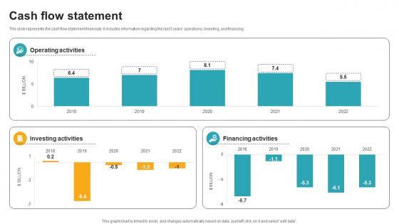 This slide represents the cash flow statement financials. It includes information regarding the last 5 years operations, investing, and financing.Boost your pitch with our creative Cash Flow Statement Innovative Industrial Solutions Company Profile CP SS V. Deliver an awe-inspiring pitch that will mesmerize everyone. Using these presentation templates you will surely catch everyones attention. You can browse the ppts collection on our website. We have researchers who are experts at creating the right content for the templates. So you do not have to invest time in any additional work. Just grab the template now and use them. This slide represents the cash flow statement financials. It includes information regarding the last 5 years operations, investing, and financing.